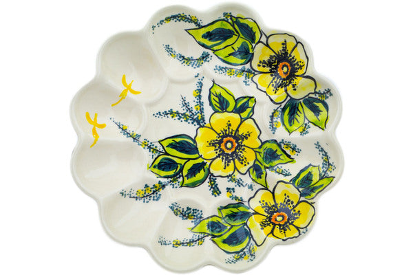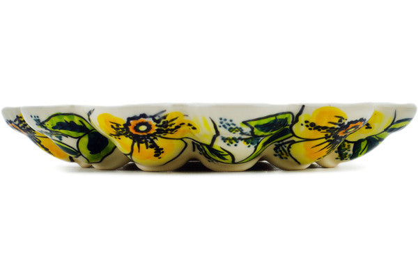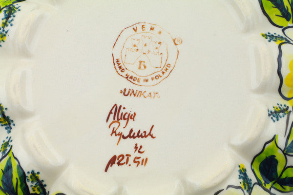 This Hawaii Sunshine 9" Egg Plate was handmade and hand decorated in Boleslawiec, Poland by skilled artisans according to old traditional methods. This is a Polish pottery Signature Unikat, which means that it has been hand painted with both sponges and brushes and it is signed by the artist who painted it. Unikat pieces are the most intricate works of art. Larger Unikat items take hours of very careful work to finish. This Polish stoneware is microwave, dishwasher, freezer, and oven safe up to 480°F. It does not contain lead or cadmium. It is part of the Hawaii Sunshine Collection.