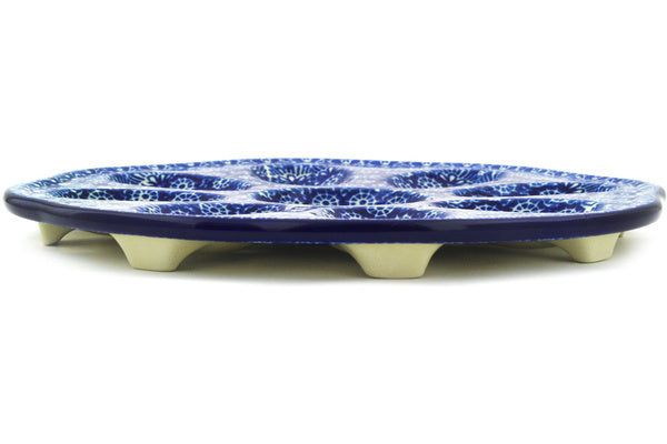 This Winter Frost 9" Egg Plate was handmade and hand decorated in Boleslawiec, Poland by skilled artisans according to old traditional methods. This Polish stoneware is microwave, dishwasher, freezer, and oven safe up to 480°F. It does not contain lead or cadmium. It is part of the Winter Frost Collection.