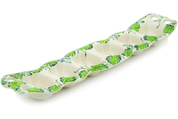 This Monstera Deliciosa 18" Egg Server was handmade and hand decorated in Boleslawiec, Poland by skilled artisans according to old traditional methods. This Polish stoneware is microwave, dishwasher, freezer, and oven safe up to 480°F. It does not contain lead or cadmium. It is part of the Monstera Deliciosa Collection.