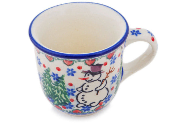 This Dancing Snowman 2 oz Espresso Cup was handmade and hand decorated in Boleslawiec, Poland by skilled artisans according to old traditional methods. This is a Polish pottery Signature Unikat, which means that it has been hand painted with both sponges and brushes and it is signed by the artist who painted it. Unikat pieces are the most intricate works of art. Larger Unikat items take hours of very careful work to finish. This Polish stoneware is microwave, dishwasher, freezer, and oven safe up to 480°F. It does not contain lead or cadmium. It is part of the Dancing Snowman Collection.