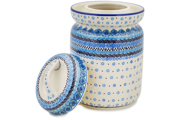 This Sparkling Sea 118 oz Fermenting Crock with Water Seal Airlock was handmade and hand decorated in Boleslawiec, Poland by skilled artisans according to old traditional methods. This is a Polish pottery Signature Unikat, which means that it has been hand painted with both sponges and brushes and it is signed by the artist who painted it. Unikat pieces are the most intricate works of art. Larger Unikat items take hours of very careful work to finish. This Polish stoneware is microwave, dishwasher, freezer, and oven safe up to 480°F. It does not contain lead or cadmium. It is part of the Sparkling Sea Collection.