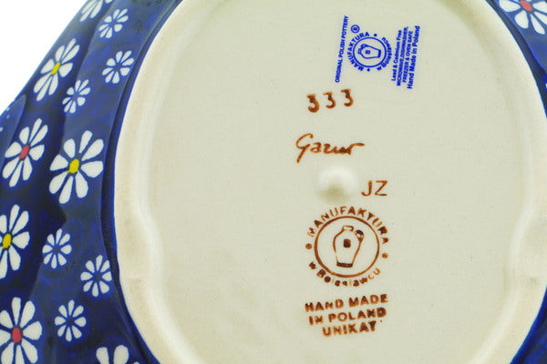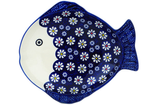 This Daisy Jazz 10" Fish Shaped Platter was handmade and hand decorated in Boleslawiec, Poland by skilled artisans according to old traditional methods. This is a Polish pottery Signature Unikat, which means that it has been hand painted with both sponges and brushes and it is signed by the artist who painted it. Unikat pieces are the most intricate works of art. Larger Unikat items take hours of very careful work to finish. This Polish stoneware is microwave, dishwasher, freezer, and oven safe up to 480°F. It does not contain lead or cadmium. It is part of the Daisy Jazz Collection.