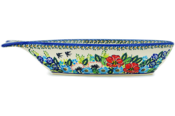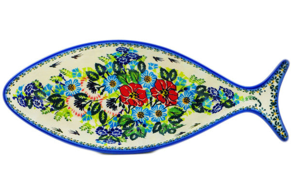 This Royal Meadow 10" Fish Shaped Platter was handmade and hand decorated in Boleslawiec, Poland by skilled artisans according to old traditional methods. This is a Polish pottery Signature Unikat, which means that it has been hand painted with both sponges and brushes and it is signed by the artist who painted it. Unikat pieces are the most intricate works of art. Larger Unikat items take hours of very careful work to finish. This Polish stoneware is microwave, dishwasher, freezer, and oven safe up to 480°F. It does not contain lead or cadmium. It is part of the Royal Meadow Collection.