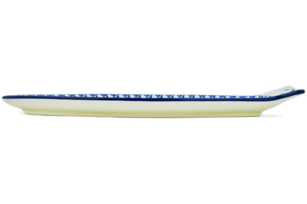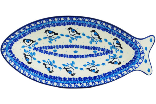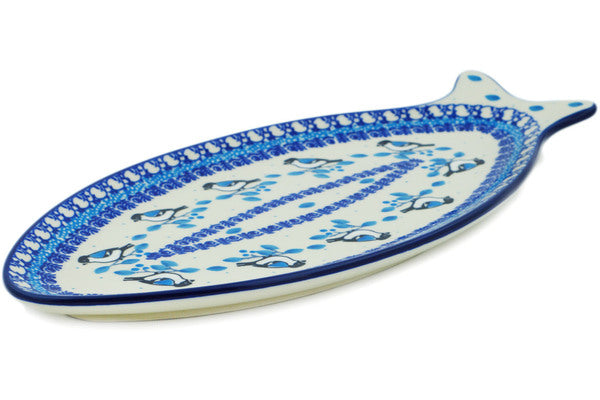 This Winter Sparrow 12" Fish Shaped Platter was handmade and hand decorated in Boleslawiec, Poland by skilled artisans according to old traditional methods. This Polish stoneware is microwave, dishwasher, freezer, and oven safe up to 480°F. It does not contain lead or cadmium. It is part of the Winter Sparrow Collection.