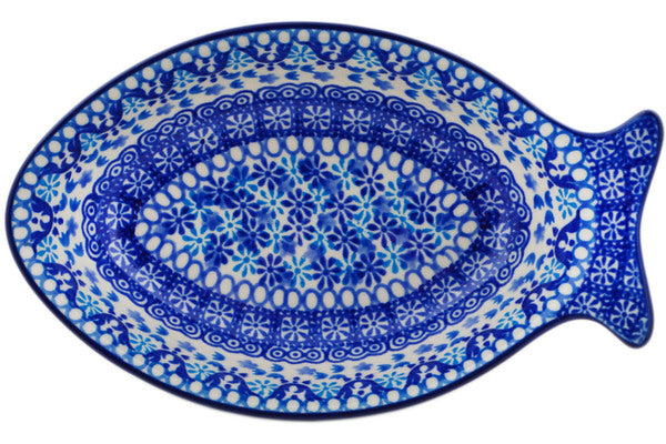 This Wonder Sky 8" Fish Shaped Platter was handmade and hand decorated in Boleslawiec, Poland by skilled artisans according to old traditional methods. This Polish stoneware is microwave, dishwasher, freezer, and oven safe up to 480°F. It does not contain lead or cadmium. It is part of the Wonder Sky Collection.