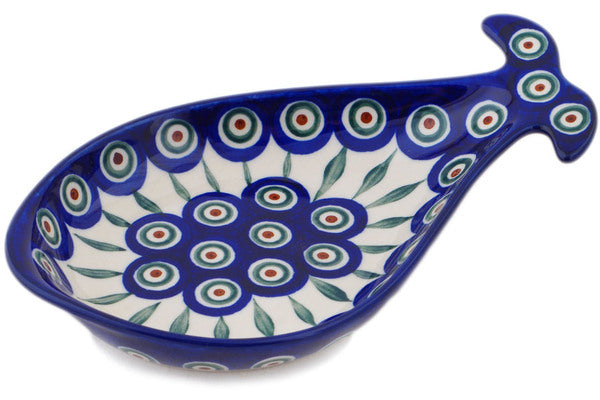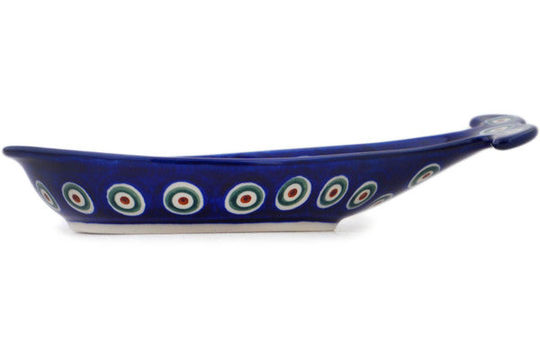 This Peacock Leaves 9" Fish Shaped Platter was handmade and hand decorated in Boleslawiec, Poland by skilled artisans according to old traditional methods. This Polish stoneware is microwave, dishwasher, freezer, and oven safe up to 480°F. It does not contain lead or cadmium. It is part of the Peacock Leaves Collection.