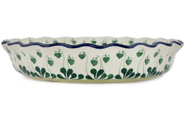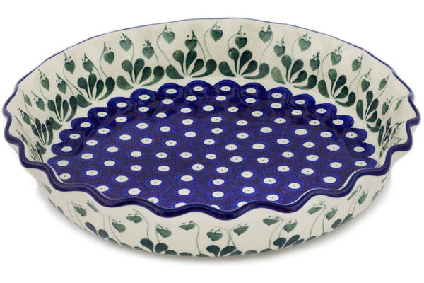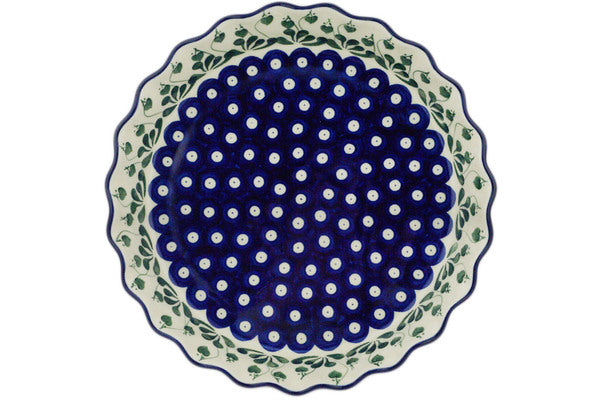 This Bleeding Heart Peacock 10" Fluted Pie Dish was handmade and hand decorated in Boleslawiec, Poland by skilled artisans according to old traditional methods. This Polish stoneware is microwave, dishwasher, freezer, and oven safe up to 480°F. It does not contain lead or cadmium. It is part of the Bleeding Heart Peacock Collection.