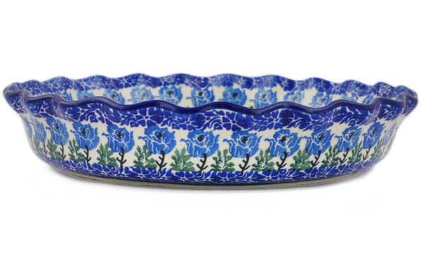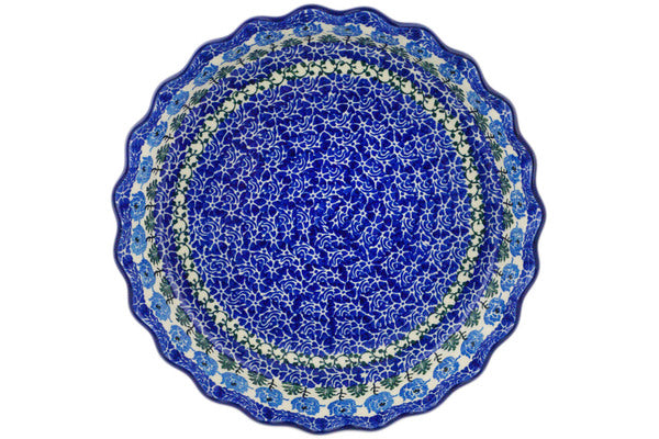This Blue Rosette Wreath 10" Fluted Pie Dish was handmade and hand decorated in Boleslawiec, Poland by skilled artisans according to old traditional methods. This Polish stoneware is microwave, dishwasher, freezer, and oven safe up to 480°F. It does not contain lead or cadmium. It is part of the Blue Rosette Wreath Collection.