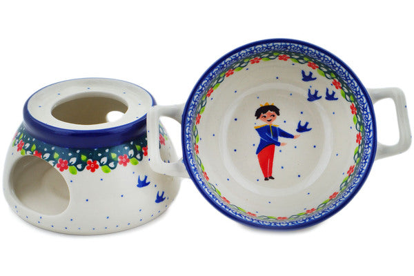 This Bird Prince 10 oz Fondue Set was handmade and hand decorated in Boleslawiec, Poland by skilled artisans according to old traditional methods. This Polish stoneware is microwave, dishwasher, freezer, and oven safe up to 480°F. It does not contain lead or cadmium. It is part of the Bird Prince Collection.