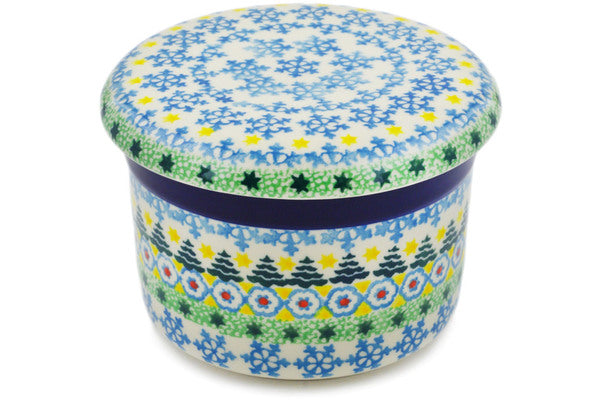 This Christmas Forest 4" French Butter Dish was handmade and hand decorated in Boleslawiec, Poland by skilled artisans according to old traditional methods. This is a Polish pottery Signature Unikat, which means that it has been hand painted with both sponges and brushes and it is signed by the artist who painted it. Unikat pieces are the most intricate works of art. Larger Unikat items take hours of very careful work to finish. This Polish stoneware is microwave, dishwasher, freezer, and oven safe up to 480°F. It does not contain lead or cadmium. It is part of the Christmas Forest Collection.