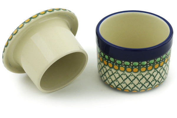This Tranquility 4" French Butter Dish was handmade and hand decorated in Boleslawiec, Poland by skilled artisans according to old traditional methods. This is a Polish pottery Signature Unikat, which means that it has been hand painted with both sponges and brushes and it is signed by the artist who painted it. Unikat pieces are the most intricate works of art. Larger Unikat items take hours of very careful work to finish. This Polish stoneware is microwave, dishwasher, freezer, and oven safe up to 480°F. It does not contain lead or cadmium. It is part of the Tranquility Collection.