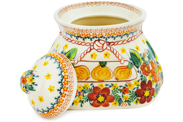 This Sunset Meadow 7" Garlic and Onion Jar was handmade and hand decorated in Boleslawiec, Poland by skilled artisans according to old traditional methods. This is a Polish pottery Signature Unikat, which means that it has been hand painted with both sponges and brushes and it is signed by the artist who painted it. Unikat pieces are the most intricate works of art. Larger Unikat items take hours of very careful work to finish. This Polish stoneware is microwave, dishwasher, freezer, and oven safe up to 480°F. It does not contain lead or cadmium. It is part of the Sunset Meadow Collection.
