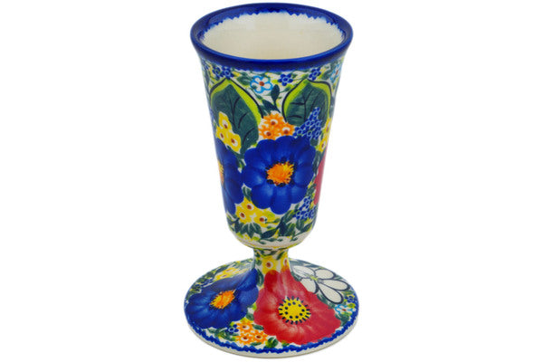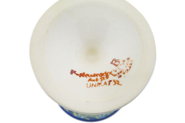 This Magical Spring 7 oz Goblet was handmade and hand decorated in Boleslawiec, Poland by skilled artisans according to old traditional methods. This is a Polish pottery Signature Unikat, which means that it has been hand painted with both sponges and brushes and it is signed by the artist who painted it. Unikat pieces are the most intricate works of art. Larger Unikat items take hours of very careful work to finish. This Polish stoneware is microwave, dishwasher, freezer, and oven safe up to 480°F. It does not contain lead or cadmium. It is part of the Magical Spring Collection.