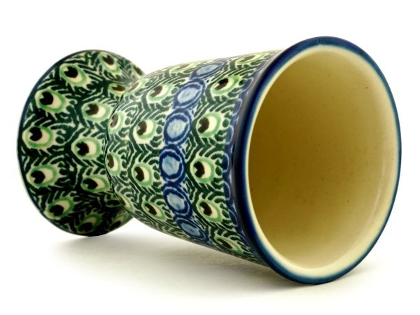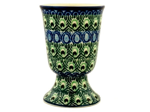 This Peacock Tail 8 oz Goblet was handmade and hand decorated in Boleslawiec, Poland by skilled artisans according to old traditional methods. This is a Polish pottery Signature Unikat, which means that it has been hand painted with both sponges and brushes and it is signed by the artist who painted it. Unikat pieces are the most intricate works of art. Larger Unikat items take hours of very careful work to finish. This Polish stoneware is microwave, dishwasher, freezer, and oven safe up to 480°F. It does not contain lead or cadmium. It is part of the Peacock Tail Collection.