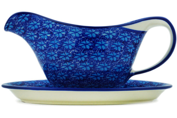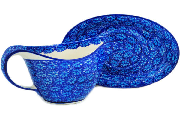 This Deep Into The Blue Sea 20 oz Gravy Boat with Saucer was handmade and hand decorated in Boleslawiec, Poland by skilled artisans according to old traditional methods. This Polish stoneware is microwave, dishwasher, freezer, and oven safe up to 480°F. It does not contain lead or cadmium. It is part of the Deep Into The Blue Sea Collection.