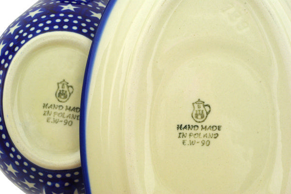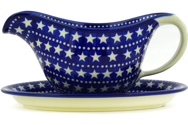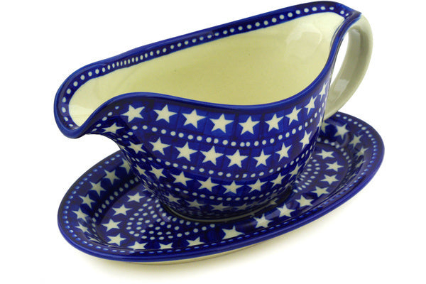 This Midnight Stars 20 oz Gravy Boat with Saucer was handmade and hand decorated in Boleslawiec, Poland by skilled artisans according to old traditional methods. This Polish stoneware is microwave, dishwasher, freezer, and oven safe up to 480°F. It does not contain lead or cadmium. It is part of the Midnight Stars Collection.