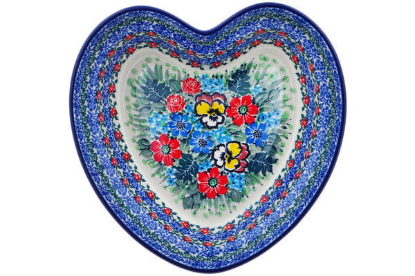 This Country Bouquet 8" Heart Shaped Bowl was handmade and hand decorated in Boleslawiec, Poland by skilled artisans according to old traditional methods. This is a Polish pottery Signature Unikat, which means that it has been hand painted with both sponges and brushes and it is signed by the artist who painted it. Unikat pieces are the most intricate works of art. Larger Unikat items take hours of very careful work to finish. This Polish stoneware is microwave, dishwasher, freezer, and oven safe up to 480°F. It does not contain lead or cadmium. It is part of the Country Bouquet Collection.