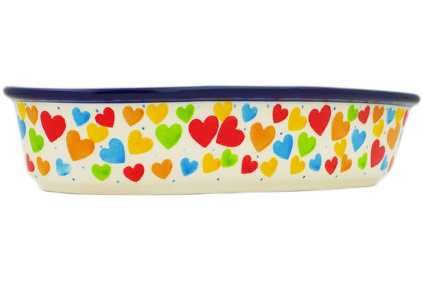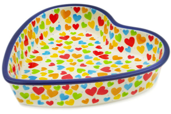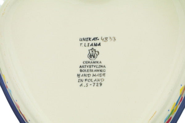 This In Love With Love 8" Heart Shaped Bowl was handmade and hand decorated in Boleslawiec, Poland by skilled artisans according to old traditional methods. This is a Polish pottery Signature Unikat, which means that it has been hand painted with both sponges and brushes and it is signed by the artist who painted it. Unikat pieces are the most intricate works of art. Larger Unikat items take hours of very careful work to finish. This Polish stoneware is microwave, dishwasher, freezer, and oven safe up to 480°F. It does not contain lead or cadmium. It is part of the In Love With Love Collection.