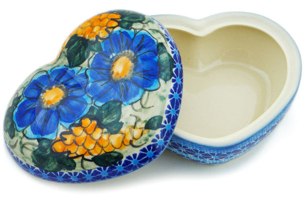 This Corn In The Blue 5" Heart Shaped Jar was handmade and hand decorated in Boleslawiec, Poland by skilled artisans according to old traditional methods. This is a Polish pottery Signature Unikat, which means that it has been hand painted with both sponges and brushes and it is signed by the artist who painted it. Unikat pieces are the most intricate works of art. Larger Unikat items take hours of very careful work to finish. This Polish stoneware is microwave, dishwasher, freezer, and oven safe up to 480°F. It does not contain lead or cadmium. It is part of the Corn In The Blue Collection.