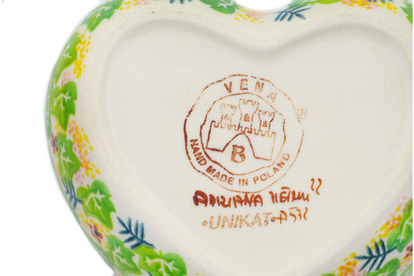 This Wild Peonies 5" Heart Shaped Jar was handmade and hand decorated in Boleslawiec, Poland by skilled artisans according to old traditional methods. This is a Polish pottery Signature Unikat, which means that it has been hand painted with both sponges and brushes and it is signed by the artist who painted it. Unikat pieces are the most intricate works of art. Larger Unikat items take hours of very careful work to finish. This Polish stoneware is microwave, dishwasher, freezer, and oven safe up to 480°F. It does not contain lead or cadmium. It is part of the Wild Peonies Collection.