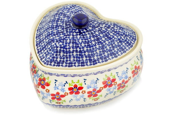 This Red Flower Meadow 7" Heart Shaped Jar was handmade and hand decorated in Boleslawiec, Poland by skilled artisans according to old traditional methods. This Polish stoneware is microwave, dishwasher, freezer, and oven safe up to 480°F. It does not contain lead or cadmium. It is part of the Red Flower Meadow Collection.