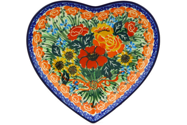 This Fiery Bouquet 7" Heart Shaped Platter was handmade and hand decorated in Boleslawiec, Poland by skilled artisans according to old traditional methods. This is a Polish pottery Signature Unikat, which means that it has been hand painted with both sponges and brushes and it is signed by the artist who painted it. Unikat pieces are the most intricate works of art. Larger Unikat items take hours of very careful work to finish. This Polish stoneware is microwave, dishwasher, freezer, and oven safe up to 480°F. It does not contain lead or cadmium. It is part of the Fiery Bouquet Collection.