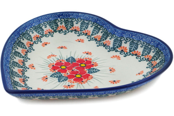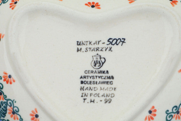 This Pink Forget Me Not 7" Heart Shaped Platter was handmade and hand decorated in Boleslawiec, Poland by skilled artisans according to old traditional methods. This is a Polish pottery Signature Unikat, which means that it has been hand painted with both sponges and brushes and it is signed by the artist who painted it. Unikat pieces are the most intricate works of art. Larger Unikat items take hours of very careful work to finish. This Polish stoneware is microwave, dishwasher, freezer, and oven safe up to 480°F. It does not contain lead or cadmium. It is part of the Pink Forget Me Not Collection.