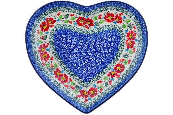 This Cherry Colored Florals 9" Heart Shaped Platter was handmade and hand decorated in Boleslawiec, Poland by skilled artisans according to old traditional methods. This is a Polish pottery Signature Unikat, which means that it has been hand painted with both sponges and brushes and it is signed by the artist who painted it. Unikat pieces are the most intricate works of art. Larger Unikat items take hours of very careful work to finish. This Polish stoneware is microwave, dishwasher, freezer, and oven safe up to 480°F. It does not contain lead or cadmium. It is part of the Cherry Colored Florals Collection.