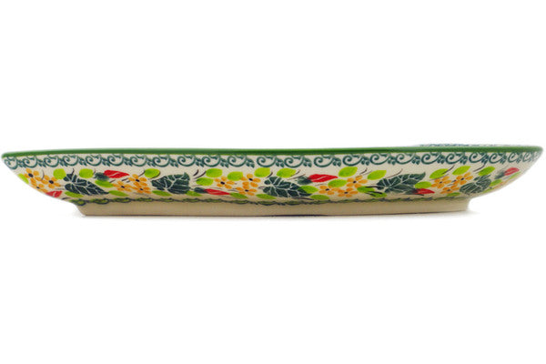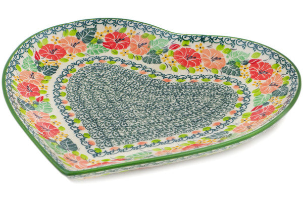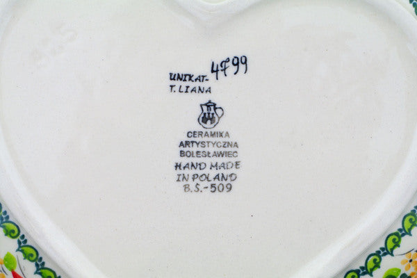 This Morning Divine 9" Heart Shaped Platter was handmade and hand decorated in Boleslawiec, Poland by skilled artisans according to old traditional methods. This is a Polish pottery Signature Unikat, which means that it has been hand painted with both sponges and brushes and it is signed by the artist who painted it. Unikat pieces are the most intricate works of art. Larger Unikat items take hours of very careful work to finish. This Polish stoneware is microwave, dishwasher, freezer, and oven safe up to 480°F. It does not contain lead or cadmium. It is part of the Morning Divine Collection.