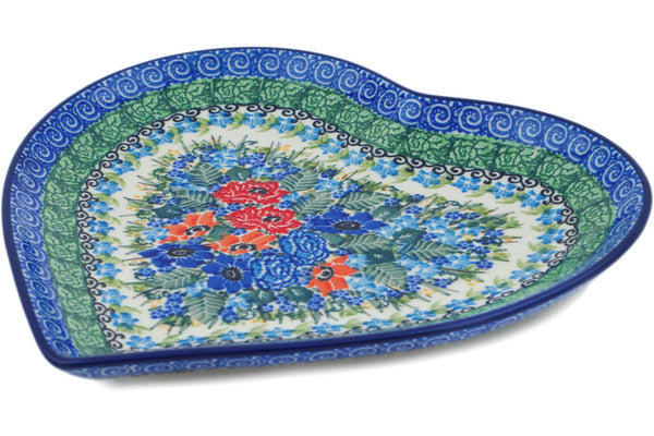 This Spring Meadow 9" Heart Shaped Platter was handmade and hand decorated in Boleslawiec, Poland by skilled artisans according to old traditional methods. This is a Polish pottery Signature Unikat, which means that it has been hand painted with both sponges and brushes and it is signed by the artist who painted it. Unikat pieces are the most intricate works of art. Larger Unikat items take hours of very careful work to finish. This Polish stoneware is microwave, dishwasher, freezer, and oven safe up to 480°F. It does not contain lead or cadmium. It is part of the Spring Meadow Collection.