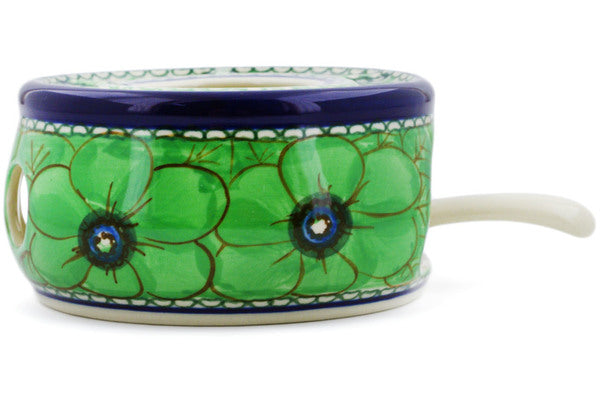 This Green Pansies 4" Heater was handmade and hand decorated in Boleslawiec, Poland by skilled artisans according to old traditional methods. This is a Polish pottery Signature Unikat, which means that it has been hand painted with both sponges and brushes and it is signed by the artist who painted it. Unikat pieces are the most intricate works of art. Larger Unikat items take hours of very careful work to finish. This Polish stoneware is microwave, dishwasher, freezer, and oven safe up to 480°F. It does not contain lead or cadmium. It is part of the Green Pansies Collection.