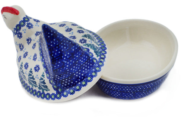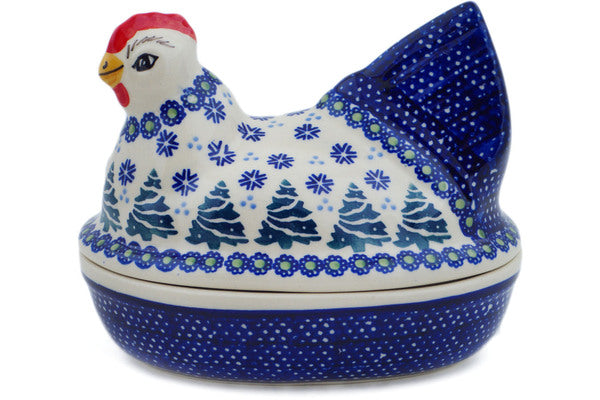 This Falling Snowflakes 7" Hen Shaped Jar was handmade and hand decorated in Boleslawiec, Poland by skilled artisans according to old traditional methods. This Polish stoneware is microwave, dishwasher, freezer, and oven safe up to 480°F. It does not contain lead or cadmium. It is part of the Falling Snowflakes Collection.