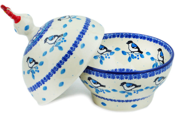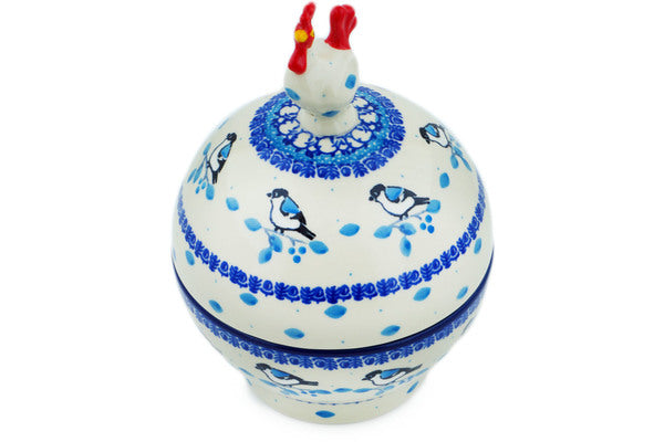 This Winter Sparrow 7" Hen Shaped Jar was handmade and hand decorated in Boleslawiec, Poland by skilled artisans according to old traditional methods. This Polish stoneware is microwave, dishwasher, freezer, and oven safe up to 480°F. It does not contain lead or cadmium. It is part of the Winter Sparrow Collection.