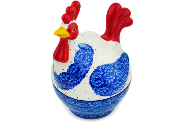 This Deep Into The Blue Sea 8" Hen Shaped Jar was handmade and hand decorated in Boleslawiec, Poland by skilled artisans according to old traditional methods. This Polish stoneware is microwave, dishwasher, freezer, and oven safe up to 480°F. It does not contain lead or cadmium. It is part of the Deep Into The Blue Sea Collection.