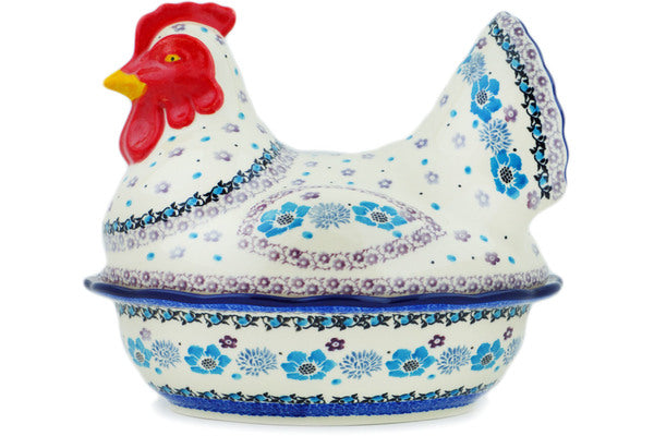 This Blooming Blues 9" Hen Shaped Jar was handmade and hand decorated in Boleslawiec, Poland by skilled artisans according to old traditional methods. This Polish stoneware is microwave, dishwasher, freezer, and oven safe up to 480°F. It does not contain lead or cadmium. It is part of the Blooming Blues Collection.