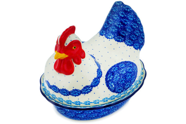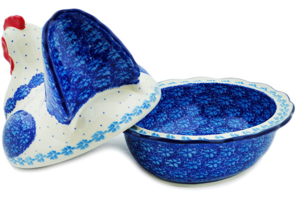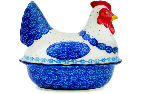 This Deep Into The Blue Sea 9" Hen Shaped Jar was handmade and hand decorated in Boleslawiec, Poland by skilled artisans according to old traditional methods. This Polish stoneware is microwave, dishwasher, freezer, and oven safe up to 480°F. It does not contain lead or cadmium. It is part of the Deep Into The Blue Sea Collection.