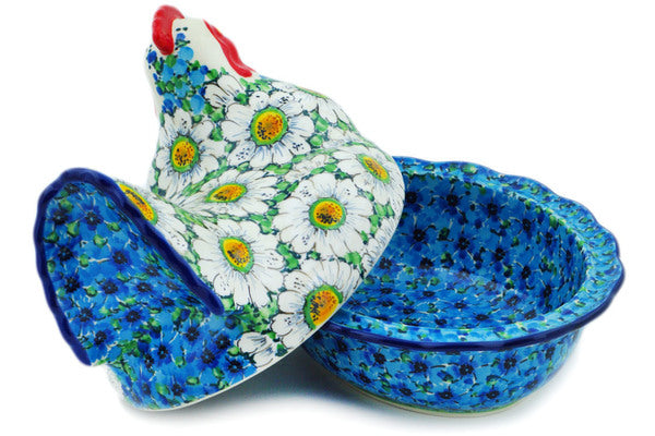 This Pansies And Daisies 9" Hen Shaped Jar was handmade and hand decorated in Boleslawiec, Poland by skilled artisans according to old traditional methods. This is a Polish pottery Signature Unikat, which means that it has been hand painted with both sponges and brushes and it is signed by the artist who painted it. Unikat pieces are the most intricate works of art. Larger Unikat items take hours of very careful work to finish. This Polish stoneware is microwave, dishwasher, freezer, and oven safe up to 480°F. It does not contain lead or cadmium. It is part of the Pansies And Daisies Collection.