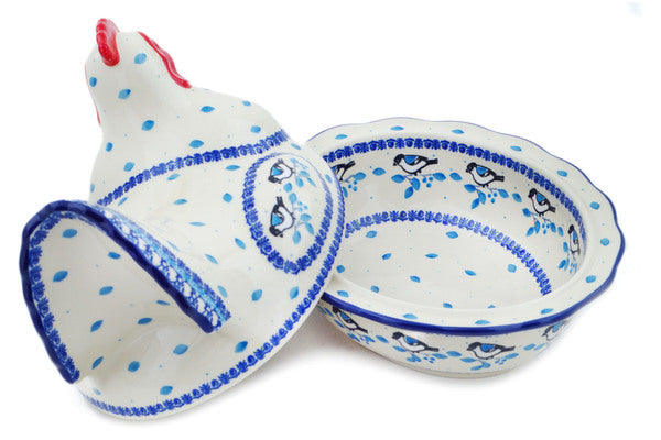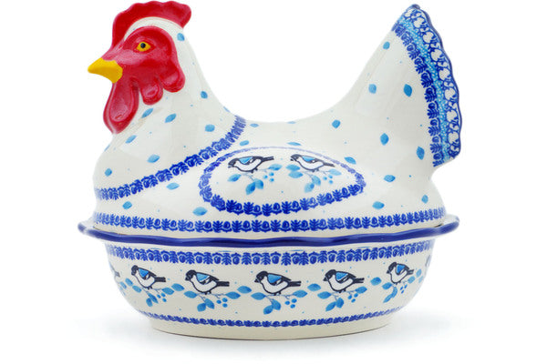 This Winter Sparrow 9" Hen Shaped Jar was handmade and hand decorated in Boleslawiec, Poland by skilled artisans according to old traditional methods. This Polish stoneware is microwave, dishwasher, freezer, and oven safe up to 480°F. It does not contain lead or cadmium. It is part of the Winter Sparrow Collection.