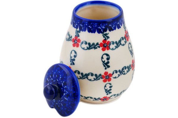 This Red Flower Lattice 9 oz Honey Jar was handmade and hand decorated in Boleslawiec, Poland by skilled artisans according to old traditional methods. This Polish stoneware is microwave, dishwasher, freezer, and oven safe up to 480°F. It does not contain lead or cadmium. It is part of the Red Flower Lattice Collection.