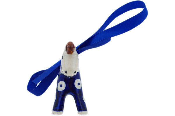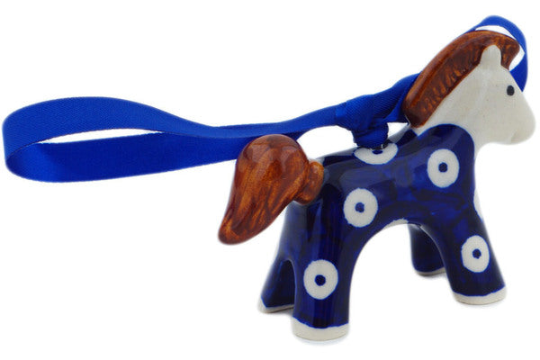 This Peacock Eyes 3" Horse Ornament was handmade and hand decorated in Boleslawiec, Poland by skilled artisans according to old traditional methods. This Polish stoneware is microwave, dishwasher, freezer, and oven safe up to 480°F. It does not contain lead or cadmium. It is part of the Peacock Eyes Collection.