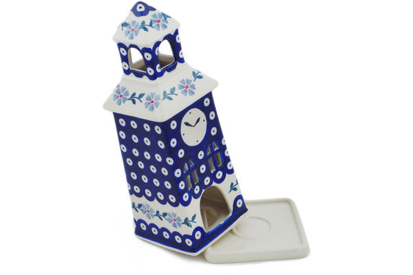 This Peacock Forget-Me-Not 11" House Figurine was handmade and hand decorated in Boleslawiec, Poland by skilled artisans according to old traditional methods. This Polish stoneware is microwave, dishwasher, freezer, and oven safe up to 480°F. It does not contain lead or cadmium. It is part of the Peacock Forget-Me-Not Collection.