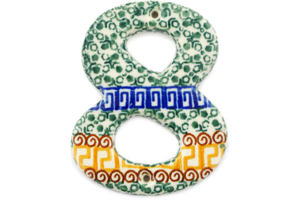 This Grecian Sea 4-inch House Number EIGHT (8) was handmade and hand decorated in Boleslawiec, Poland by skilled artisans according to old traditional methods. This Polish stoneware is microwave, dishwasher, freezer, and oven safe up to 480°F. It does not contain lead or cadmium. It is part of the Grecian Sea Collection.