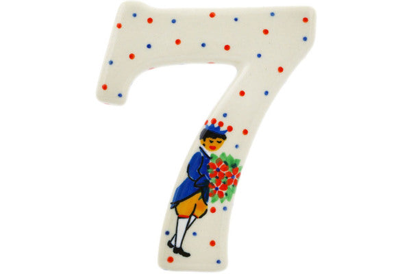 This Charming Prince 4-inch House Number SEVEN (7) was handmade and hand decorated in Boleslawiec, Poland by skilled artisans according to old traditional methods. This is a Polish pottery Signature Unikat, which means that it has been hand painted with both sponges and brushes and it is signed by the artist who painted it. Unikat pieces are the most intricate works of art. Larger Unikat items take hours of very careful work to finish. This Polish stoneware is microwave, dishwasher, freezer, and oven safe up to 480°F. It does not contain lead or cadmium. It is part of the Charming Prince Collection.