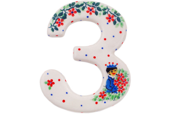 This Charming Prince 4-inch House Number THREE (3) was handmade and hand decorated in Boleslawiec, Poland by skilled artisans according to old traditional methods. This is a Polish pottery Signature Unikat, which means that it has been hand painted with both sponges and brushes and it is signed by the artist who painted it. Unikat pieces are the most intricate works of art. Larger Unikat items take hours of very careful work to finish. This Polish stoneware is microwave, dishwasher, freezer, and oven safe up to 480°F. It does not contain lead or cadmium. It is part of the Charming Prince Collection.