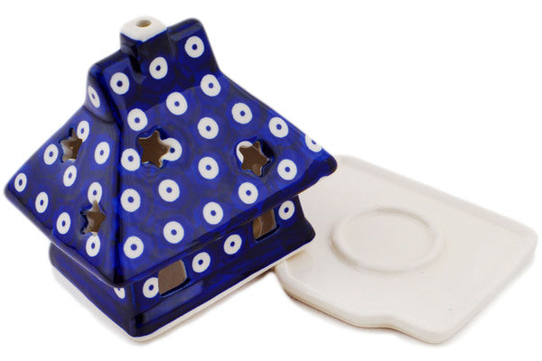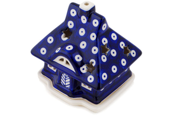 This Peacock Eyes 5" House Shaped Candle Holder was handmade and hand decorated in Boleslawiec, Poland by skilled artisans according to old traditional methods. This Polish stoneware is microwave, dishwasher, freezer, and oven safe up to 480°F. It does not contain lead or cadmium. It is part of the Peacock Eyes Collection.