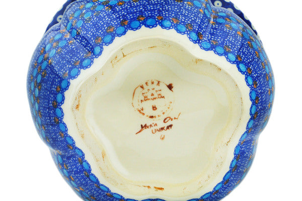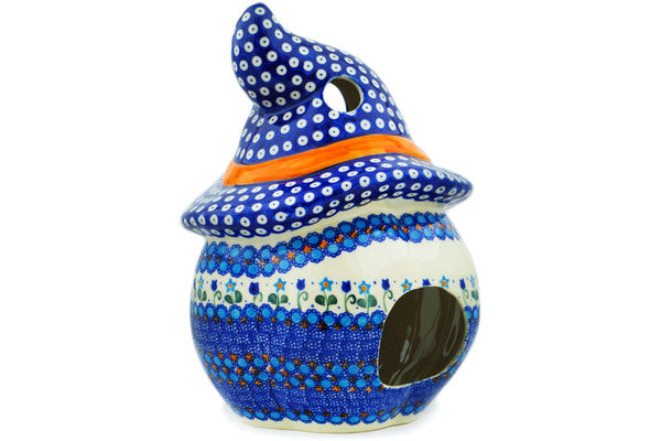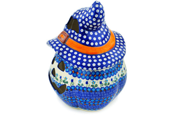 This Blue Tulip Garden 14" Jack O Lantern Candle Holder was handmade and hand decorated in Boleslawiec, Poland by skilled artisans according to old traditional methods. This is a Polish pottery Signature Unikat, which means that it has been hand painted with both sponges and brushes and it is signed by the artist who painted it. Unikat pieces are the most intricate works of art. Larger Unikat items take hours of very careful work to finish. This Polish stoneware is microwave, dishwasher, freezer, and oven safe up to 480°F. It does not contain lead or cadmium. It is part of the Blue Tulip Garden Collection.