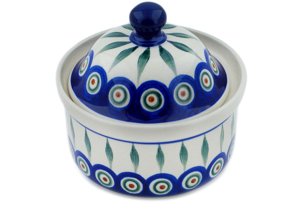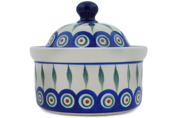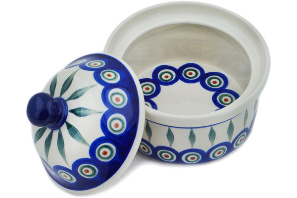 This Peacock Leaves 5" Jar with Lid was handmade and hand decorated in Boleslawiec, Poland by skilled artisans according to old traditional methods. This Polish stoneware is microwave, dishwasher, freezer, and oven safe up to 480°F. It does not contain lead or cadmium. It is part of the Peacock Leaves Collection.
