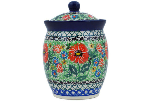 This Poppy Parade 5" Jar with Lid was handmade and hand decorated in Boleslawiec, Poland by skilled artisans according to old traditional methods. This is a Polish pottery Signature Unikat, which means that it has been hand painted with both sponges and brushes and it is signed by the artist who painted it. Unikat pieces are the most intricate works of art. Larger Unikat items take hours of very careful work to finish. This Polish stoneware is microwave, dishwasher, freezer, and oven safe up to 480°F. It does not contain lead or cadmium. It is part of the Poppy Parade Collection.