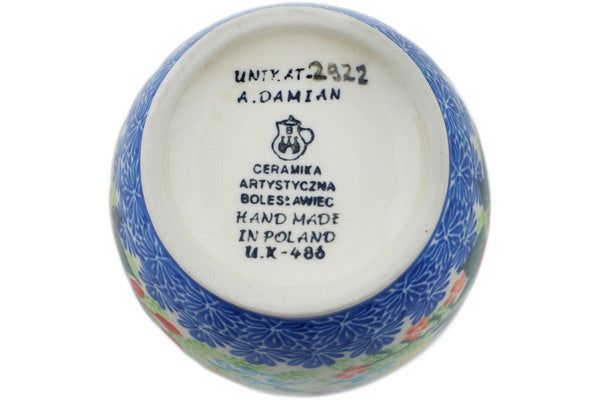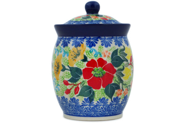 This Stellar Spring 5" Jar with Lid was handmade and hand decorated in Boleslawiec, Poland by skilled artisans according to old traditional methods. This is a Polish pottery Signature Unikat, which means that it has been hand painted with both sponges and brushes and it is signed by the artist who painted it. Unikat pieces are the most intricate works of art. Larger Unikat items take hours of very careful work to finish. This Polish stoneware is microwave, dishwasher, freezer, and oven safe up to 480°F. It does not contain lead or cadmium. It is part of the Stellar Spring Collection.