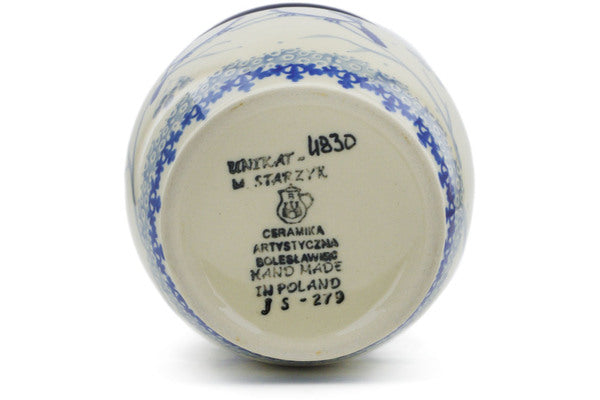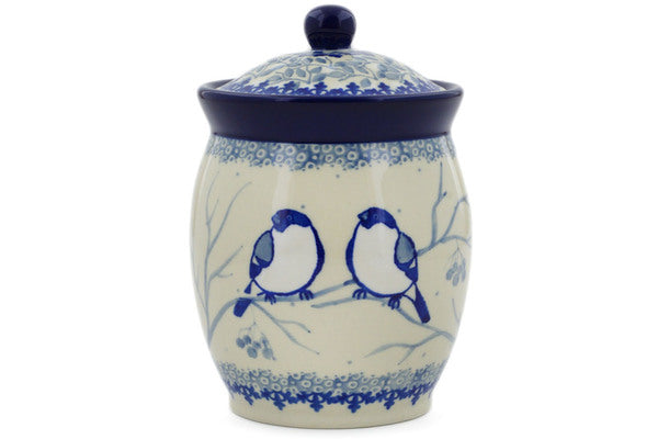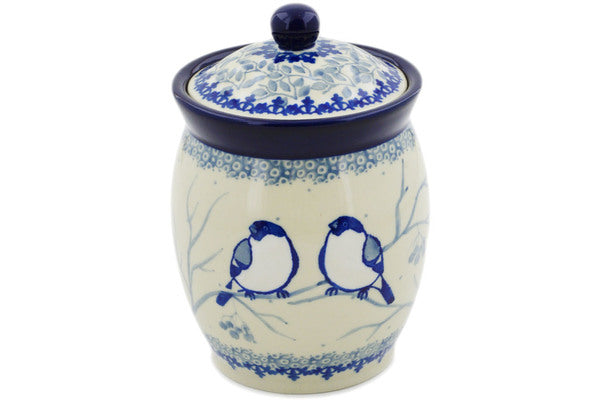 This Waiting Birds 5" Jar with Lid was handmade and hand decorated in Boleslawiec, Poland by skilled artisans according to old traditional methods. This is a Polish pottery Signature Unikat, which means that it has been hand painted with both sponges and brushes and it is signed by the artist who painted it. Unikat pieces are the most intricate works of art. Larger Unikat items take hours of very careful work to finish. This Polish stoneware is microwave, dishwasher, freezer, and oven safe up to 480°F. It does not contain lead or cadmium. It is part of the Waiting Birds Collection.